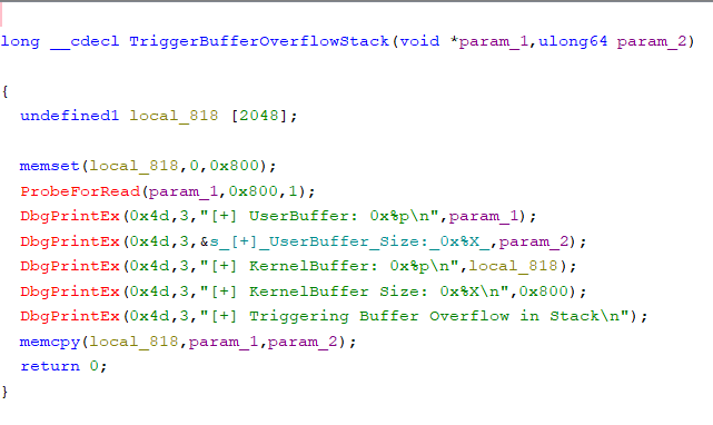 Funkcja ta kopiuje param_2 bajtów z miejsca w pamięci zdefiniowanego przez param_1 do zmiennej na stosie local_818. Jako że kontrolujemy zarówno zawartością param_1 jak i wartością param_2, możemy nadpisać stos dowolnym ciągiem bajtów o dowolnej wyznaczonej długości.